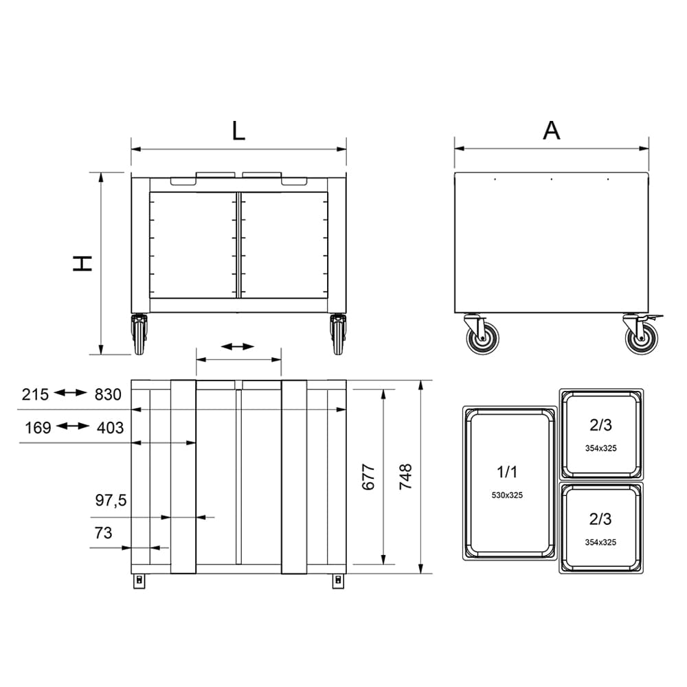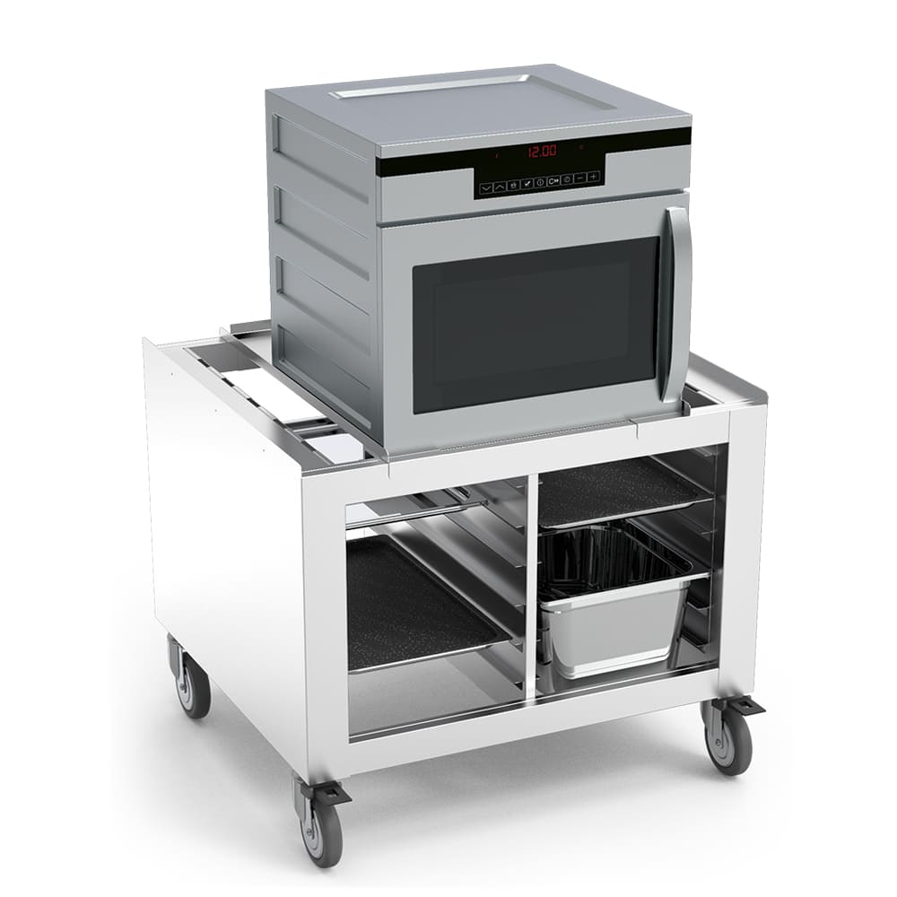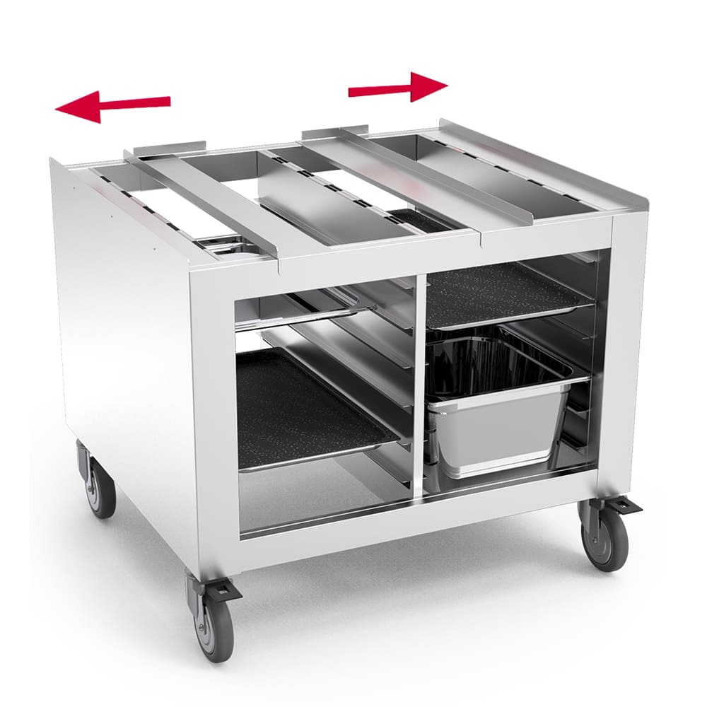 Conçu pour une organisation efficace, ce support intègre deux glissières gastronorm 1/1, chacune dotée de six niveaux, et est également compatible avec les plateaux 2/3. Il permet de stocker bacs et plaques à proximité immédiate du four, optimisant ainsi le flux de travail et la productivité. Les panneaux latéraux fermés limitent l’accumulation de saletés et facilitent le nettoyage.