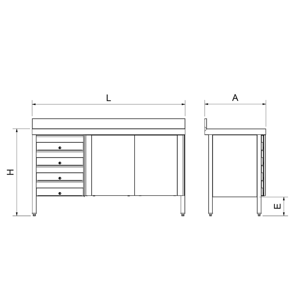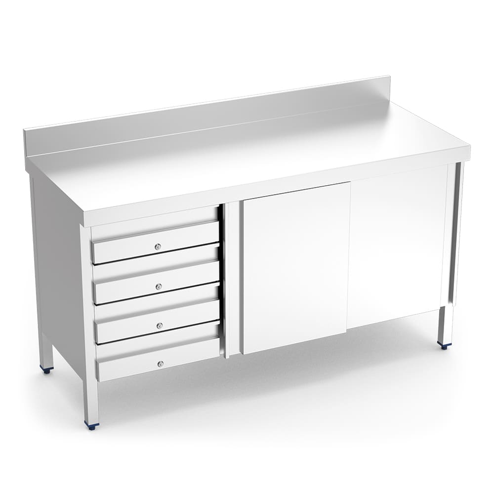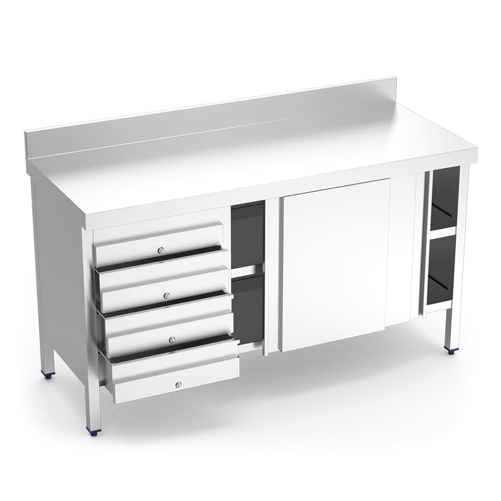 Table adossée inox professionnelle avec 4 tiroirs à gauche et de 2 à 3 portes coulissantes à droite.