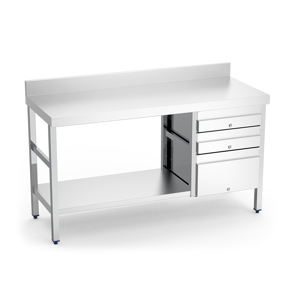 Table adossée inox professionnelle avec 3 tiroirs à droite. Plusieurs largeurs et profondeurs disponibles.