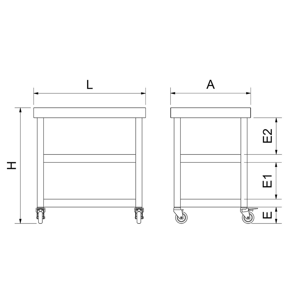 Pour une mobilité maximale, la table est équipée de quatre roues robustes, facilitant son déplacement sans effort, notamment lors du nettoyage de l’espace de travail. Les deux roues avant avec frein garantissent une stabilité parfaite et préviennent tout déplacement involontaire. Les roues en acier galvanisé avec bandage en caoutchouc assurent une excellente maniabilité et protègent les sols.