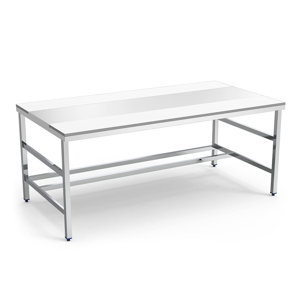 Table de découpe face à face avec châssis inox et plateau de découpe en polyéthylène.